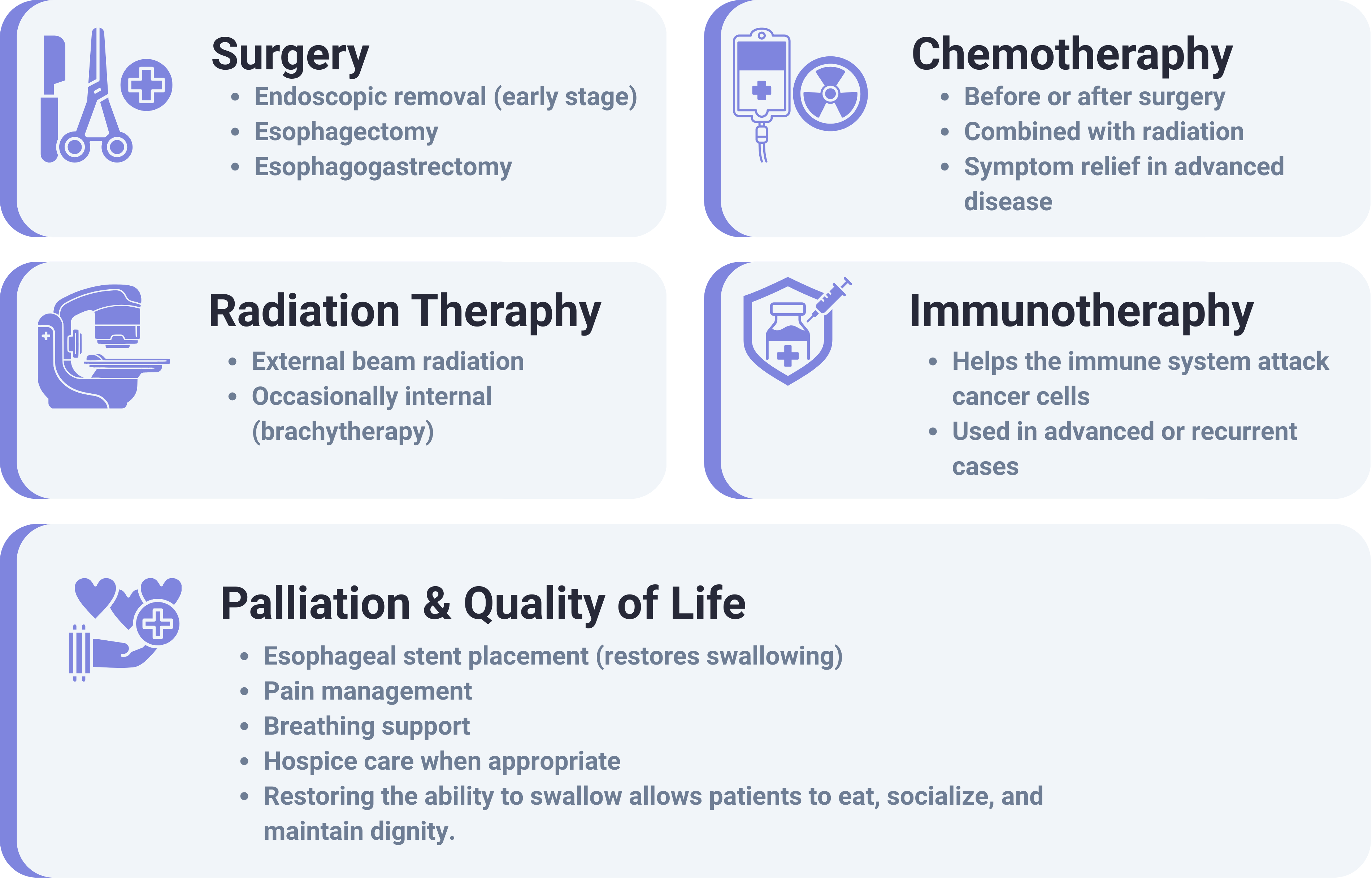 Treatment for esophageal cancer depends on the stage at diagnosis, patient health status, and available medical resources. The primary goals are to cure early-stage disease, control cancer progression in advanced stages, and improve quality of life.