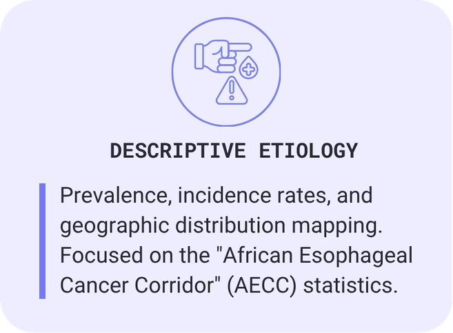 AfrECC Working Groups are subgroups within the AfrECC consortium that are focused on specific related activities. At the time of application for AfrECC membership, each potential new member will be asked which working group(s) they would like to be a member of. The AfrECC Etiology Working Group includes AfrECC members who are conducting etiologic and molecular studies of esophageal cancer in Africa. These include studies of the genetic, environmental and lifestyle risk factors and mechanistic pathways for esophageal cancer and its precursors.